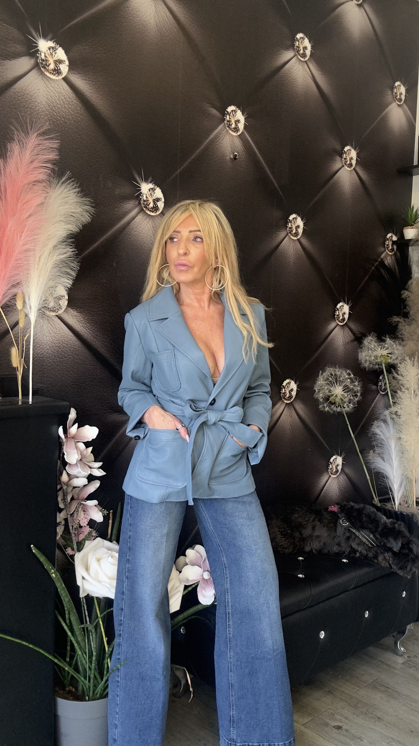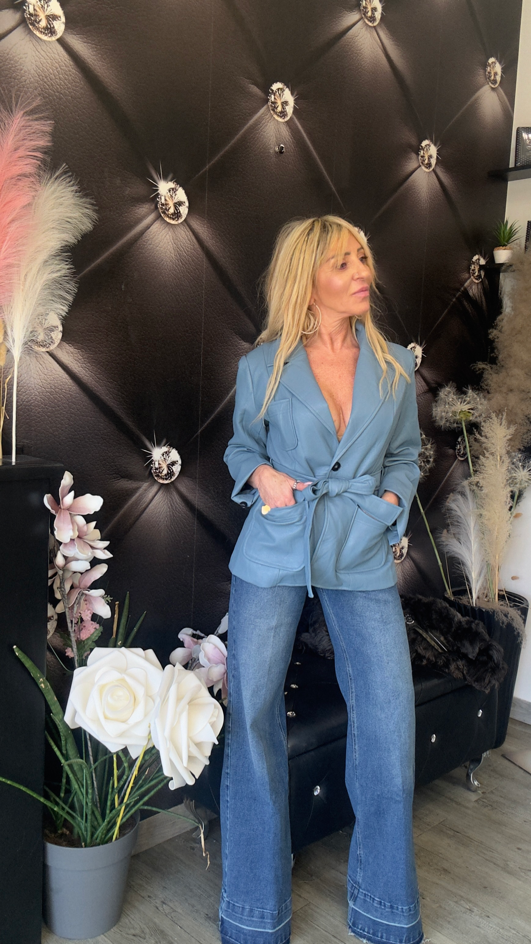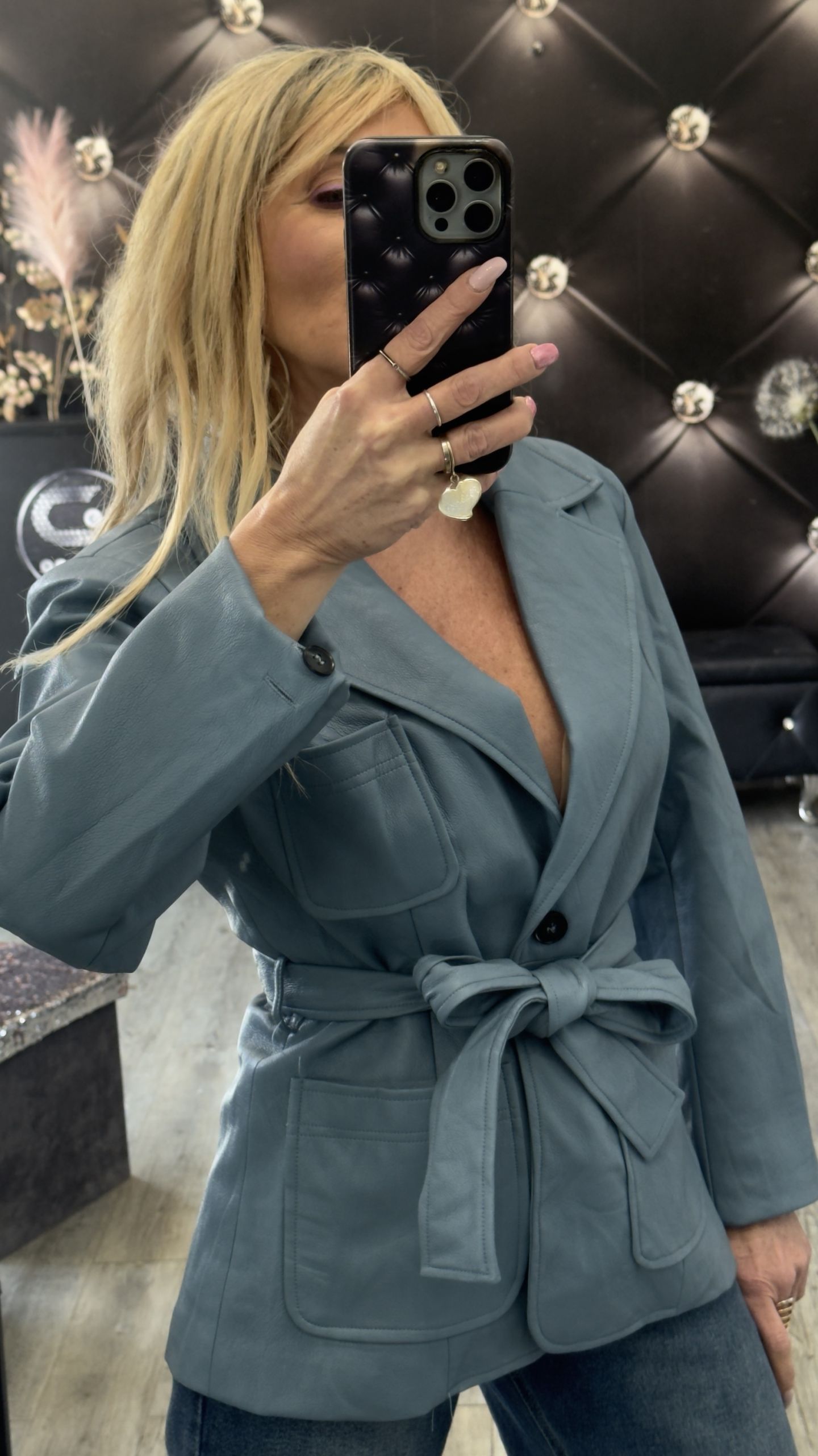 BLAZER IN ECOPELLE CON CINTURA azzurro polvere