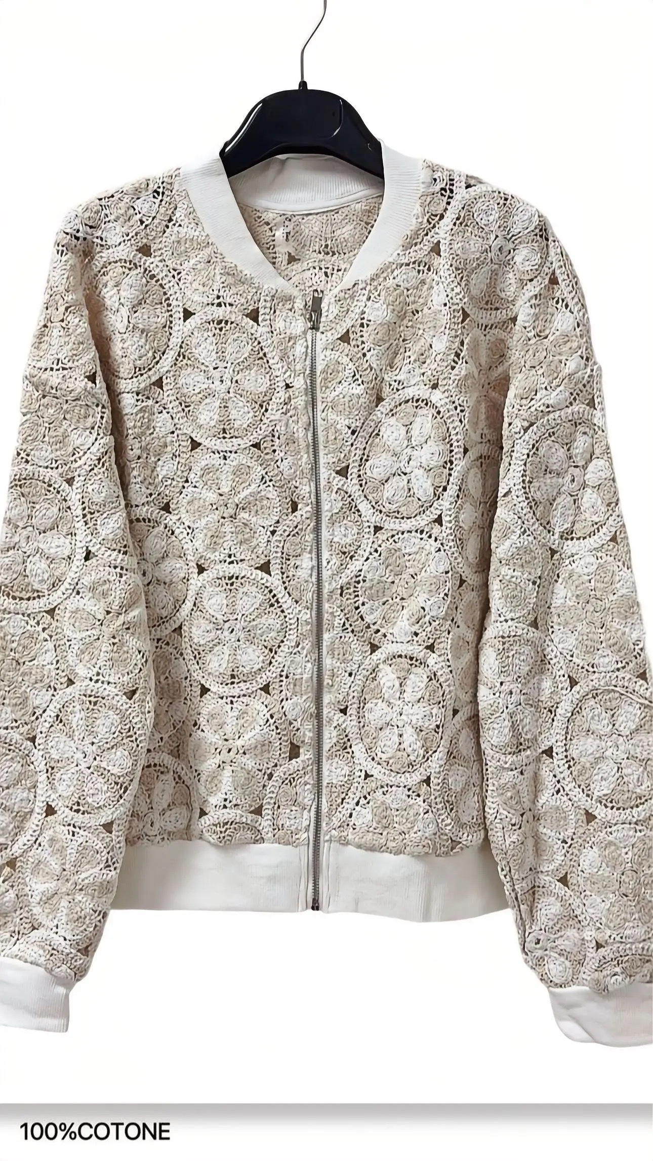 Aggiungi un tocco di eleganza romantica al tuo guardaroba casual con questo esclusivo bomber in pizzo macramé. Realizzato interamente in 100% cotone, presenta un raffinato motivo a medaglioni floreali e una silhouette morbida, perfetta per i look a strati della primavera e dell’estate.
