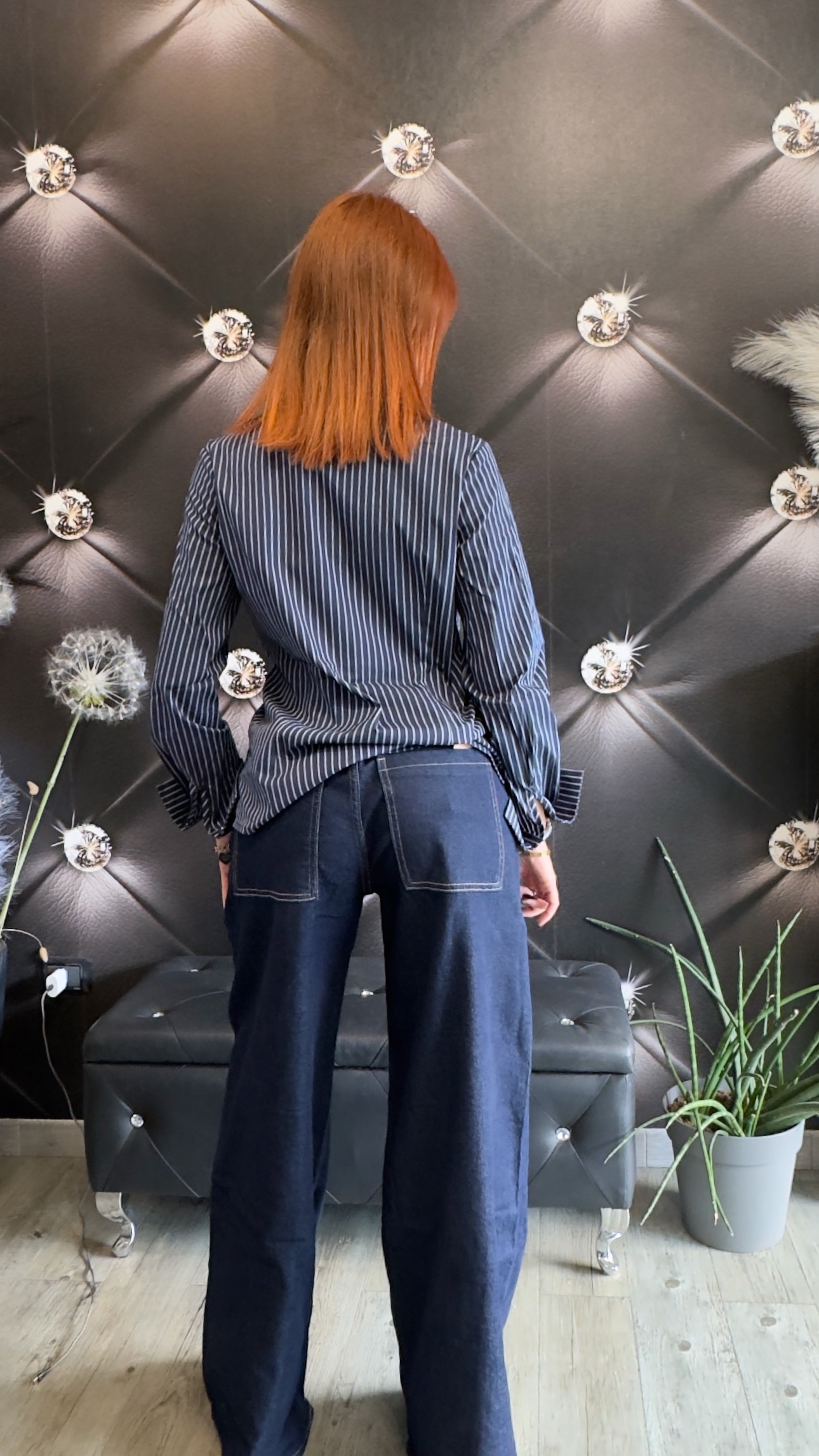 Camicia donna a righe in stile sartoriale, con taglio classico e vestibilità femminile. Realizzata in cotone elasticizzato, presenta righe verticali color perla su base blu navy, perfette per slanciare la figura. Colletto strutturato, polsini alti e chiusura frontale con bottoni nascosti. Versatile e senza tempo, ideale da indossare sia in ufficio che per look più casual chic.