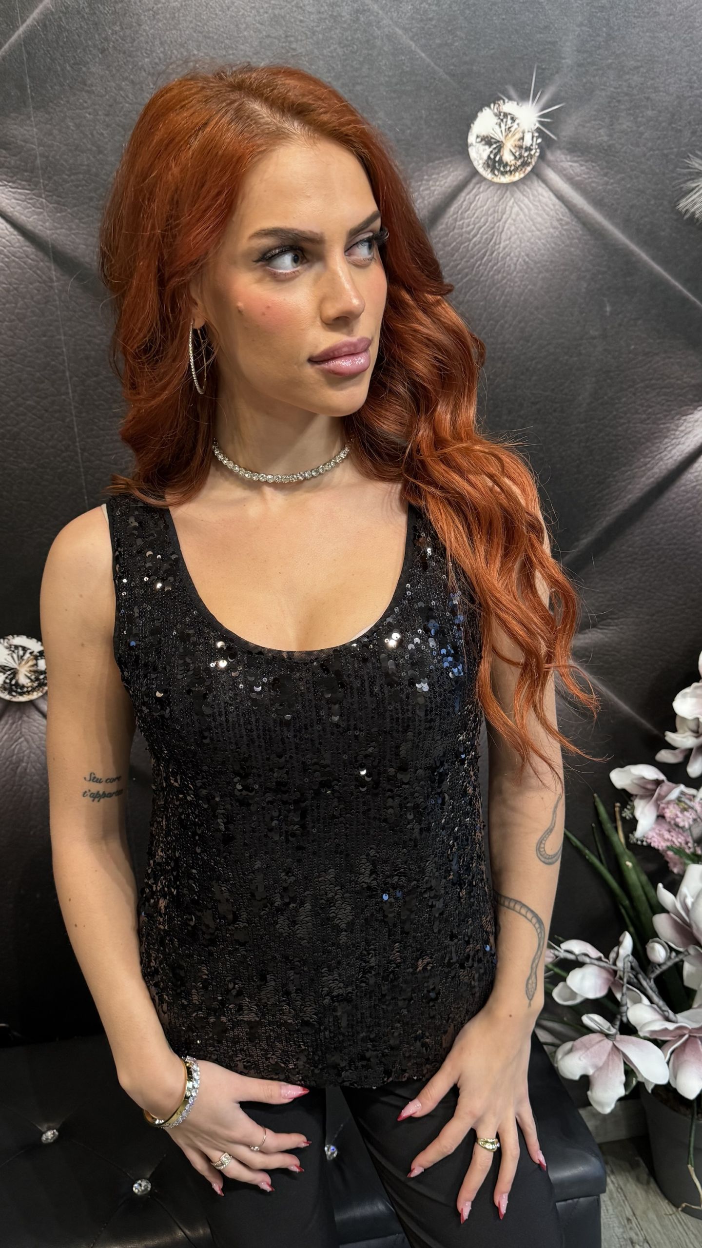 Brilla con questo splendidotop in paillettes nero . Ideale per aggiungere un tocco di luce e glamour ai tuoi outfit