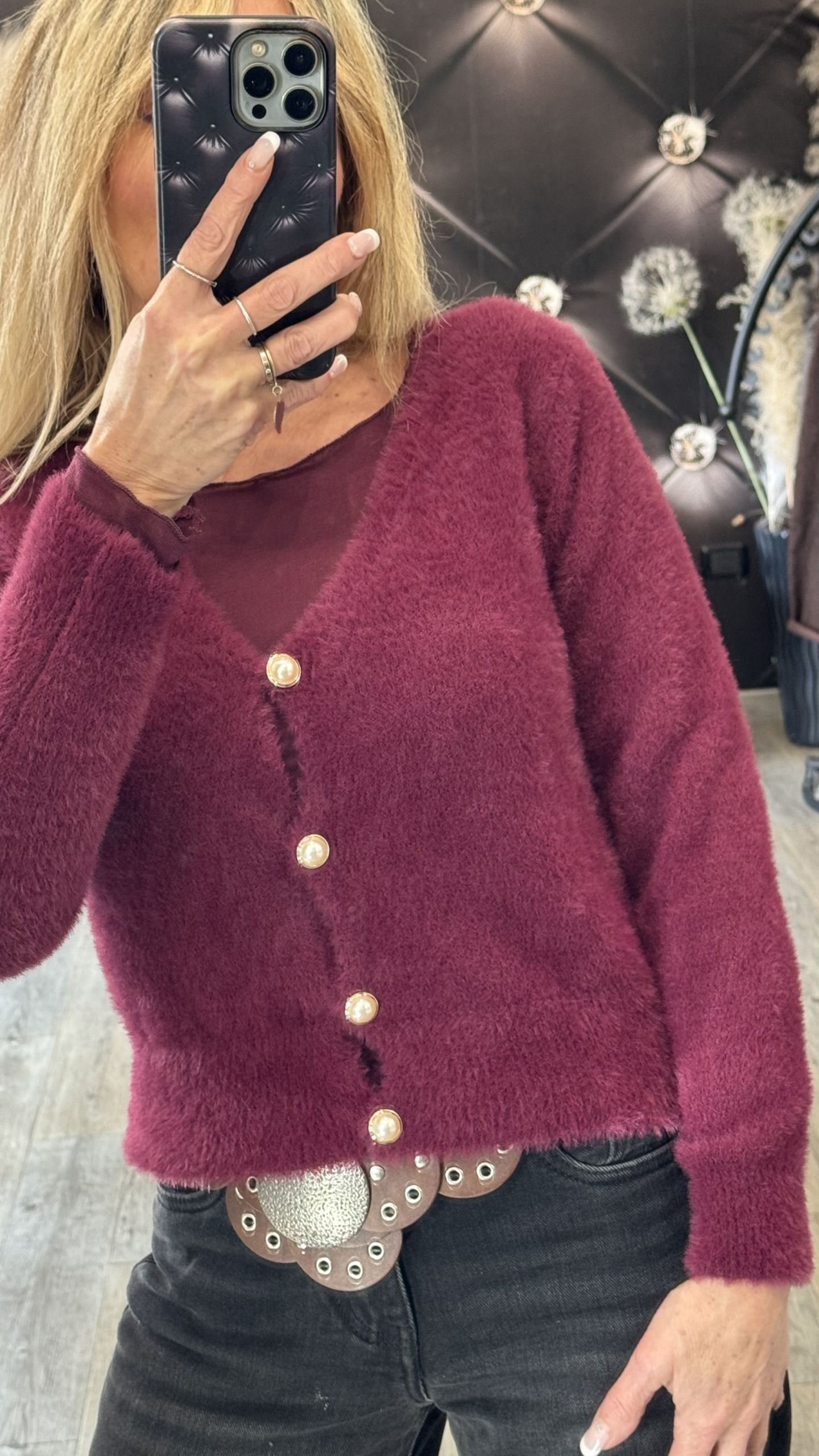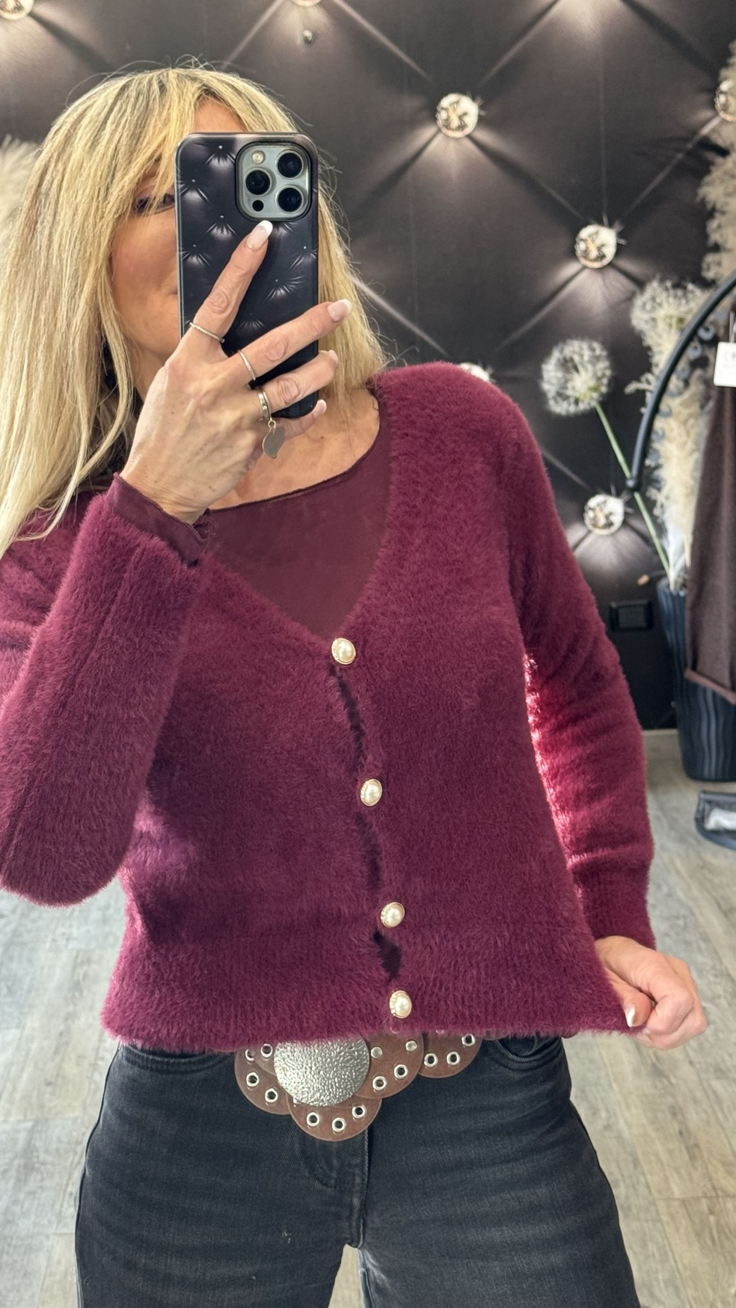 Avvolgiti nel lusso quotidiano con il nostro Cardigan peluche. Realizzato in una soffice e calda maglia effetto pelliccia questo capo è una vera coccola per la pelle. Il profondo e vibrante tono di bordeaux cattura immediatamente l’attenzione, mentre i delicati bottoni effetto perla aggiungono un tocco di inaspettata eleganza.
