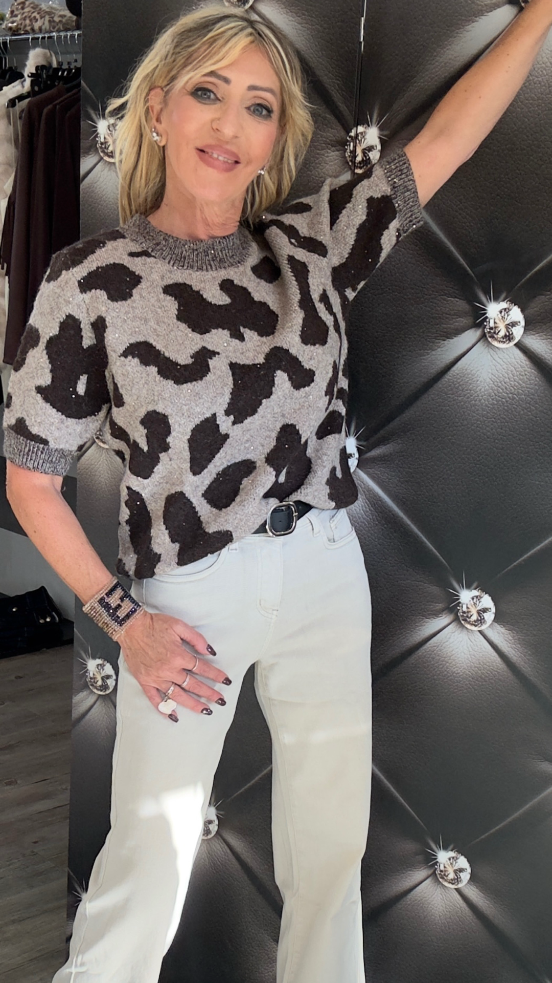 Scopri il fascino graffiante della maglia Wild Chic: un modello a manica corta con stampa animalier, arricchita da un sottile filo lurex e micro paillettes che donano luce e carattere. Perfetta da sola o sotto blazer e cappotti, per look audaci ma sempre eleganti. Un capo che parla chiaro: la giungla urbana è il tuo habitat.