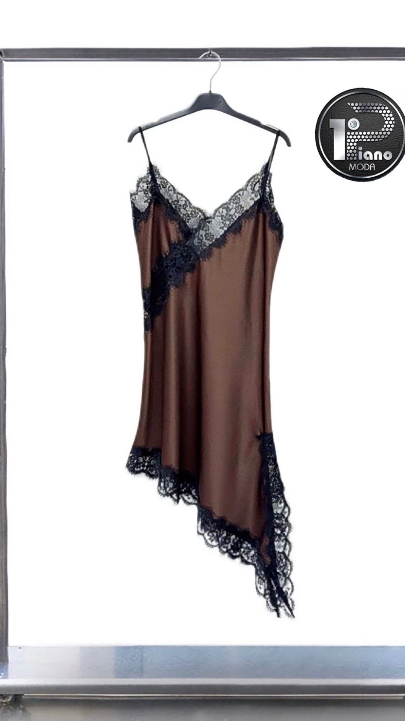 Lui è l’abito che fa impazzire il web! In satin cioccolato luminoso con profili in pizzo, si distingue per la sua linea asimmetrica e il dettaglio glam che lo rende protagonista.